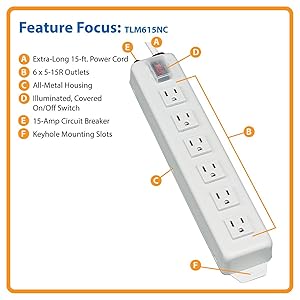 The Tripp Lite TLM615NC Power It! 6 Outlet Power Strip offers reliable, convenient and cost-effective power distribution for appliances, power tools, lighting and other electrical equipment. It includes 6 NEMA 5-15R outlets, an extra long 15 ft. power cord and keyhole mounting slots. Multi-outlet strip reduces cable clutter and enables the connection of multiple electrical devices to a single AC wall socket. This power strip features a rugged metal case to stand up to the most demanding environments, an illuminated power switch with transparent cover to prevent accidental shutoff and a 15 amp integrated circuit breaker to prevent dangerous overloads.